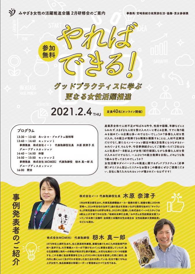 事例発表は、宮崎県内企業の株式会社イート様、株式会社MOMIKI様です。