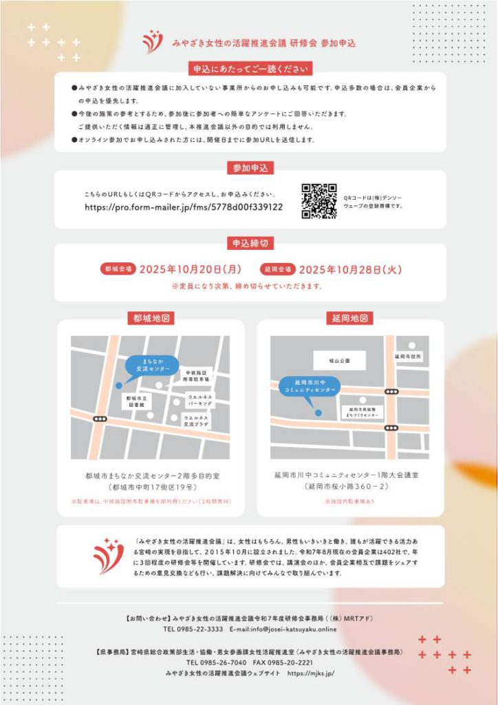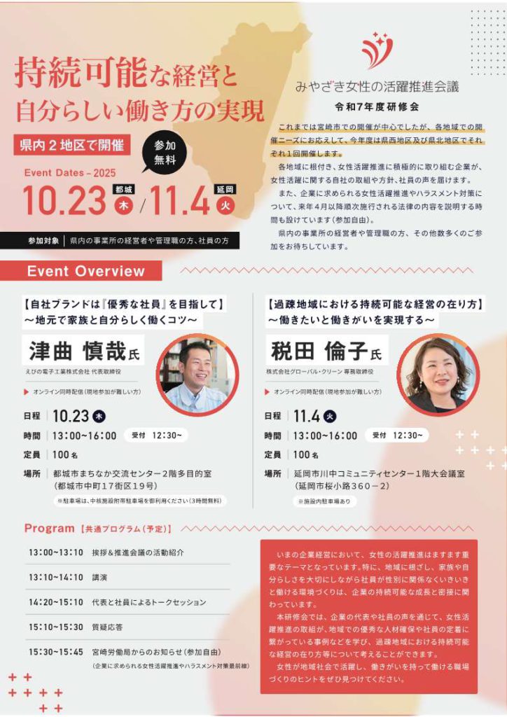 〈事業所の経営者や管理職の方等必見!〉「みやざき女性の活躍推進会議」研修会の参加者募集